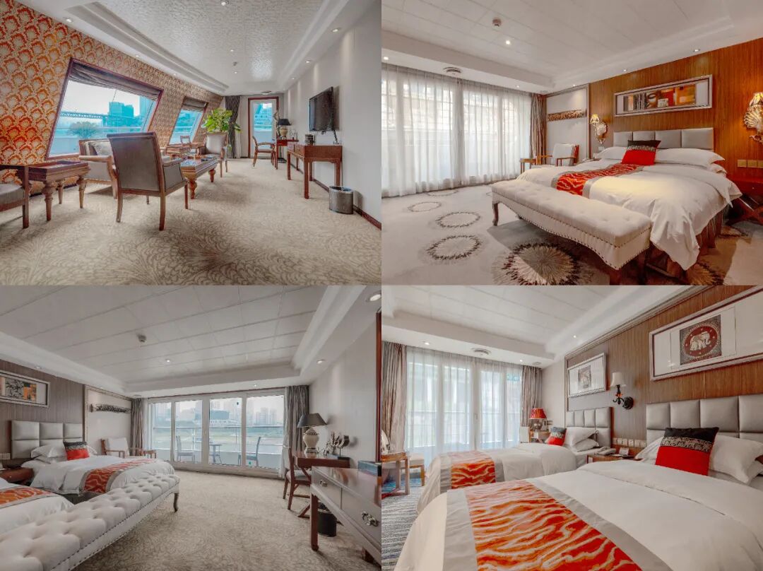 黄金游轮拥有200间房间,拥有豪华标准/大床房、行政标准/大床房、豪华套房、行政套房、总统套房7种不同房型,将床的尺寸、平均单人使用面积最大化,全江景露台,能满足不同需求。